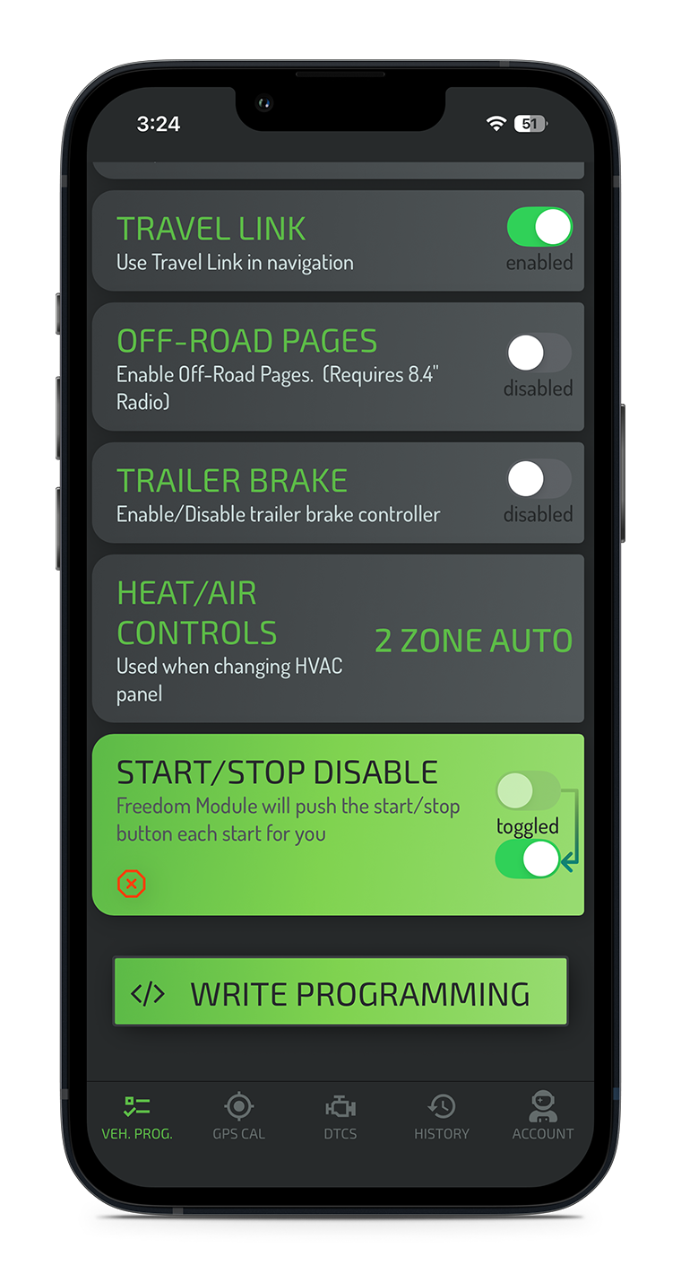 Once installed, Freedom Module features can be configured in the ECRI app, just like other modules on your Jeep.